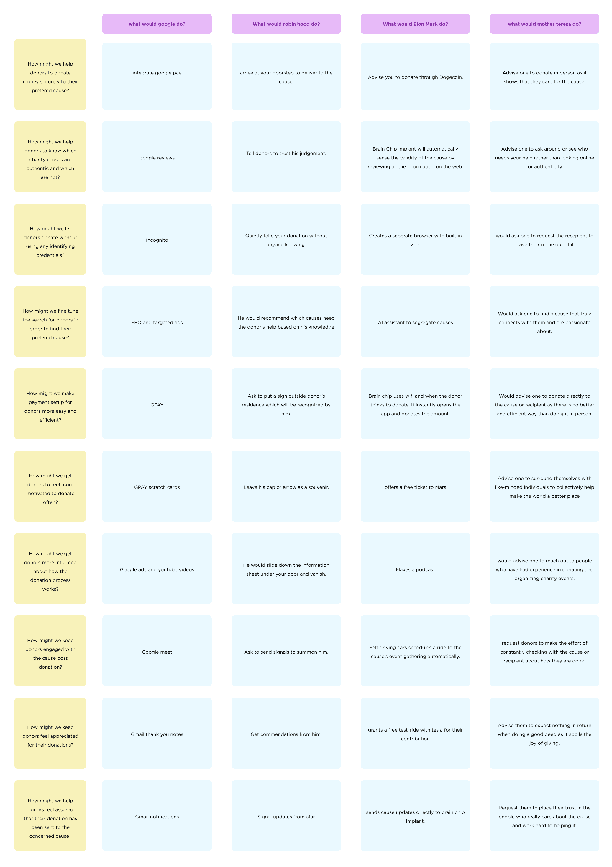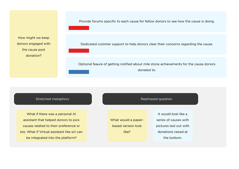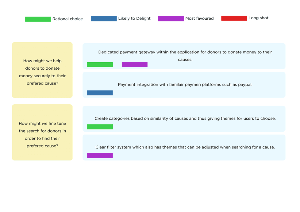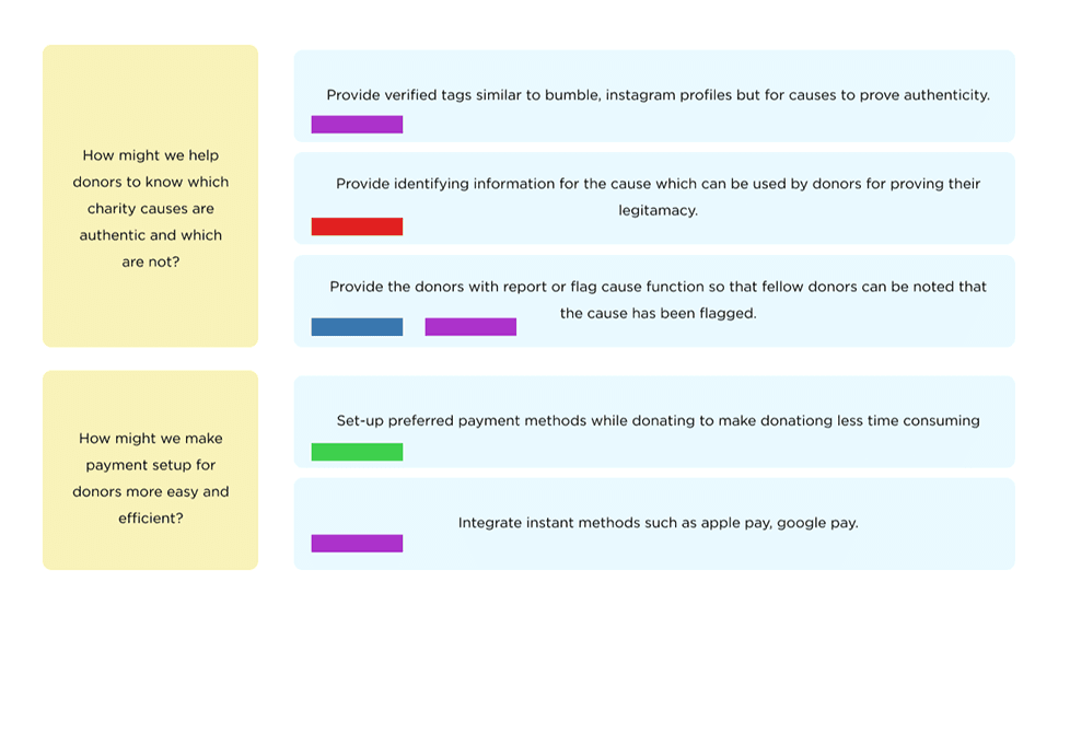 Based on the “how might we” questions developed earlier in the ideation stage, rapid idea generation technique was employed with these questions at the forefront.