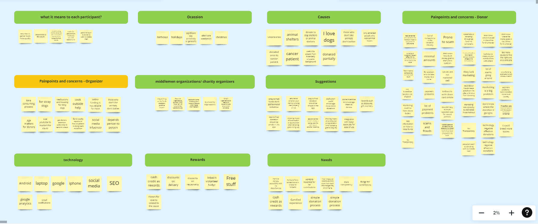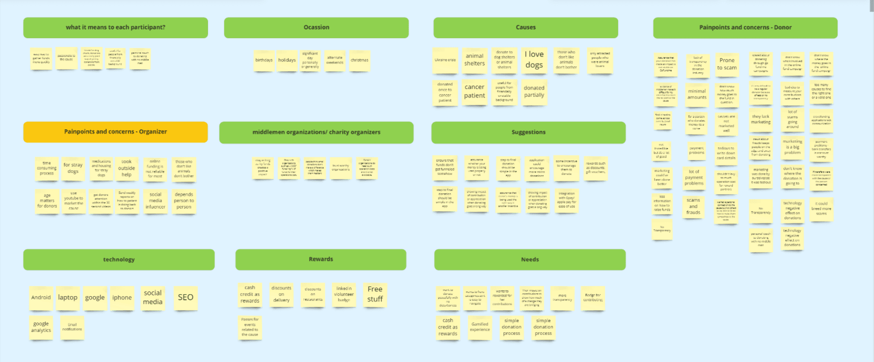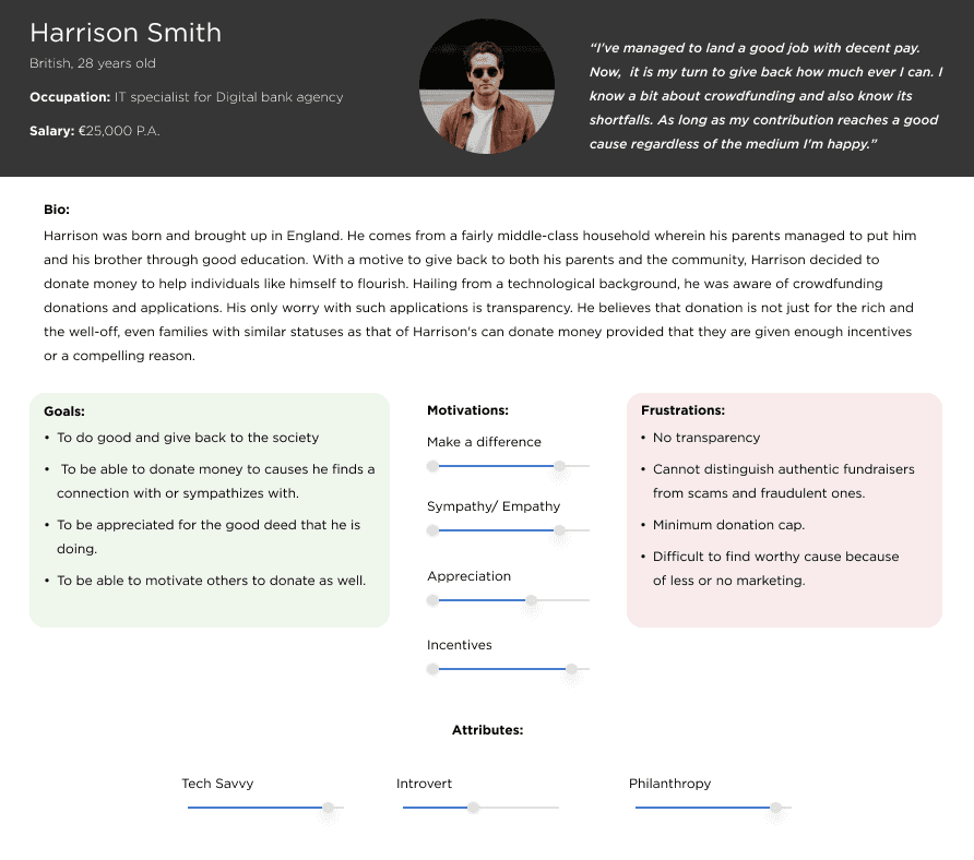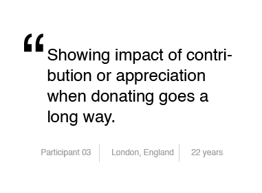 A series of in-depth interviews were then conducted on 5 participants to further identify pain points, frustrations, needs, and desires with existing crowdfunding applications and donation to causes in general.