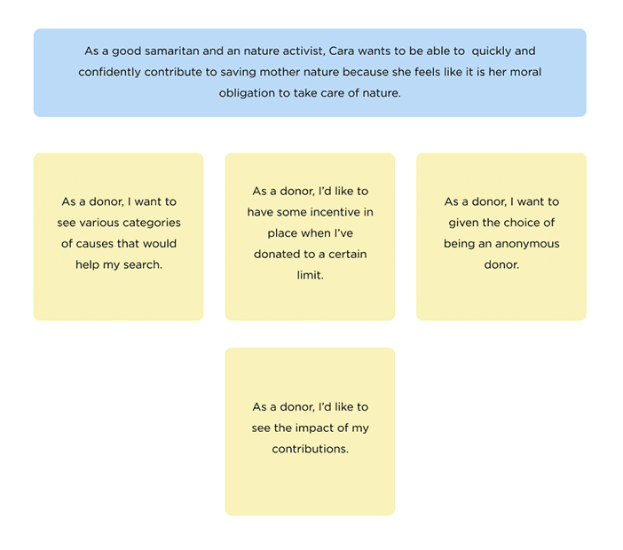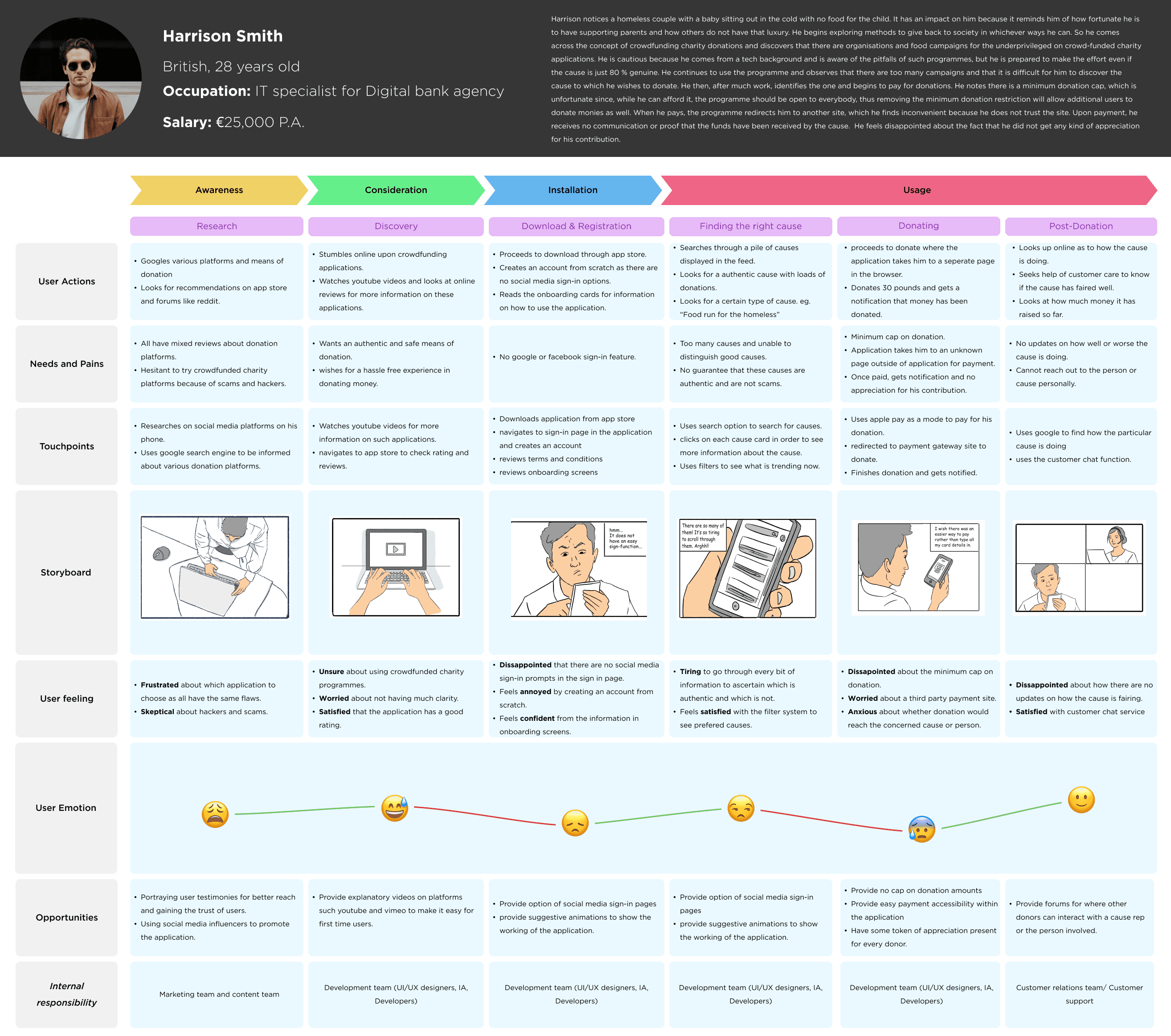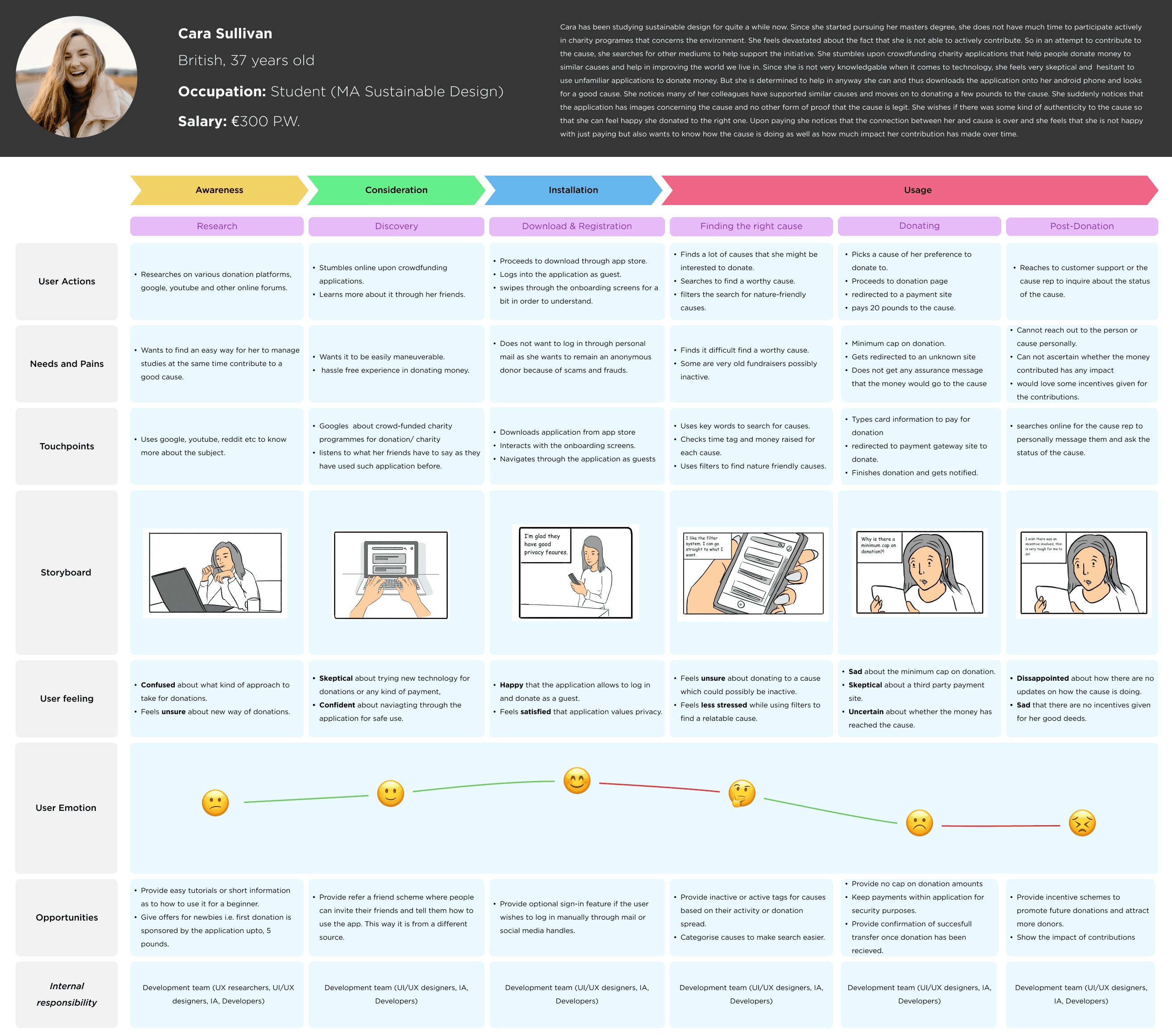 Based on the personas that were created customer journey maps were developed to gain a better understanding of how users felt during the entire experience of donating through an existing crowdfunding application.