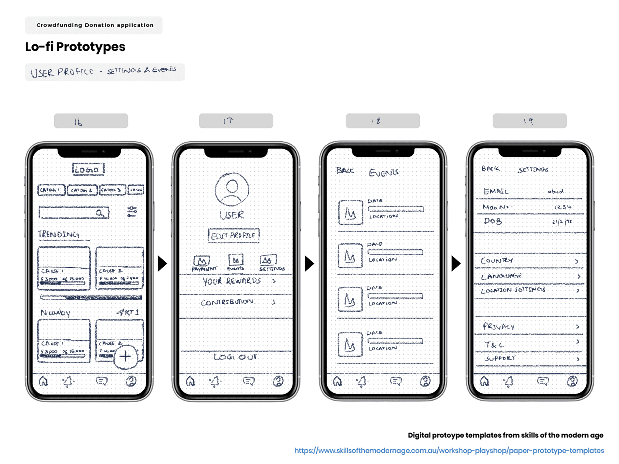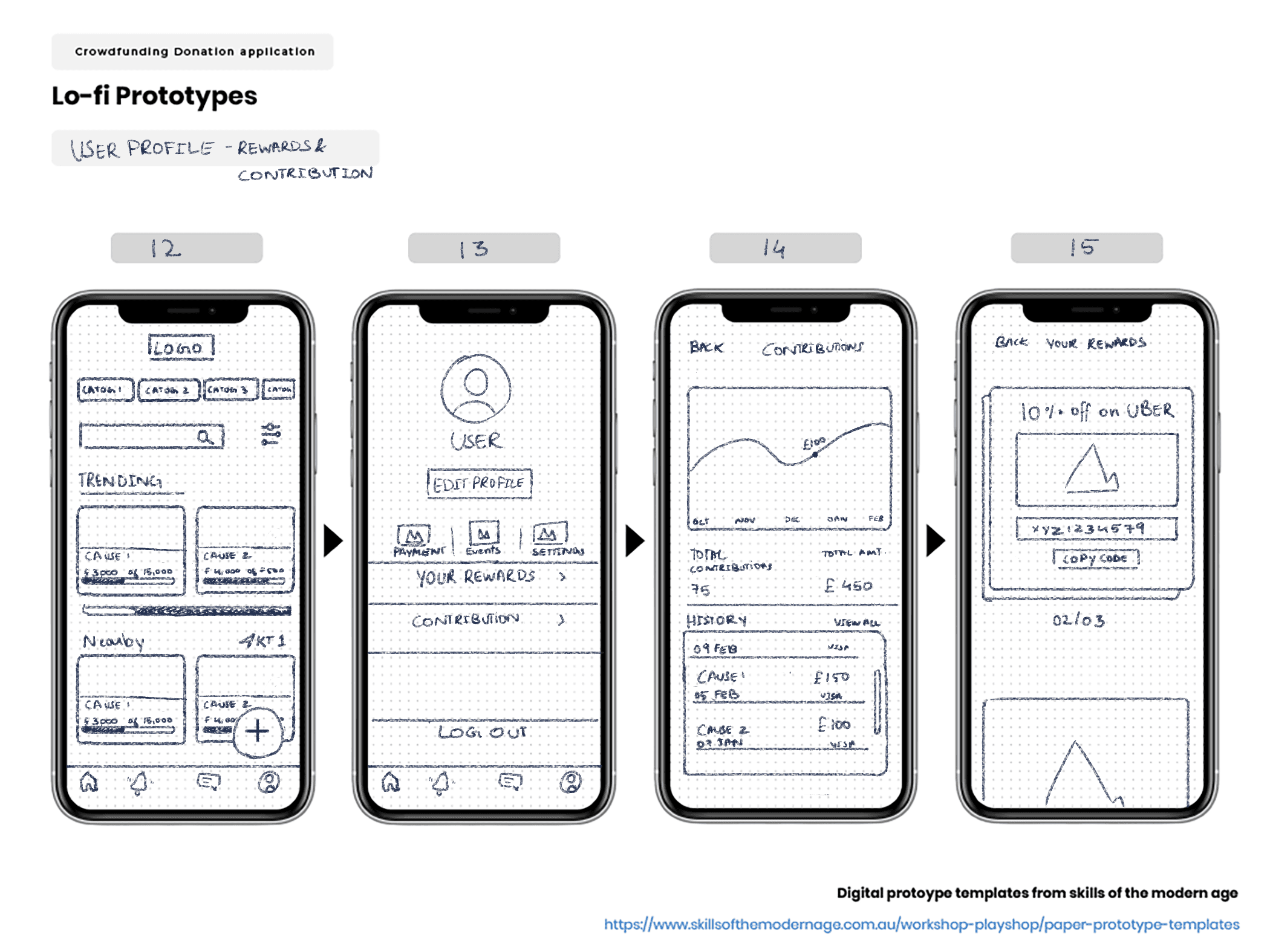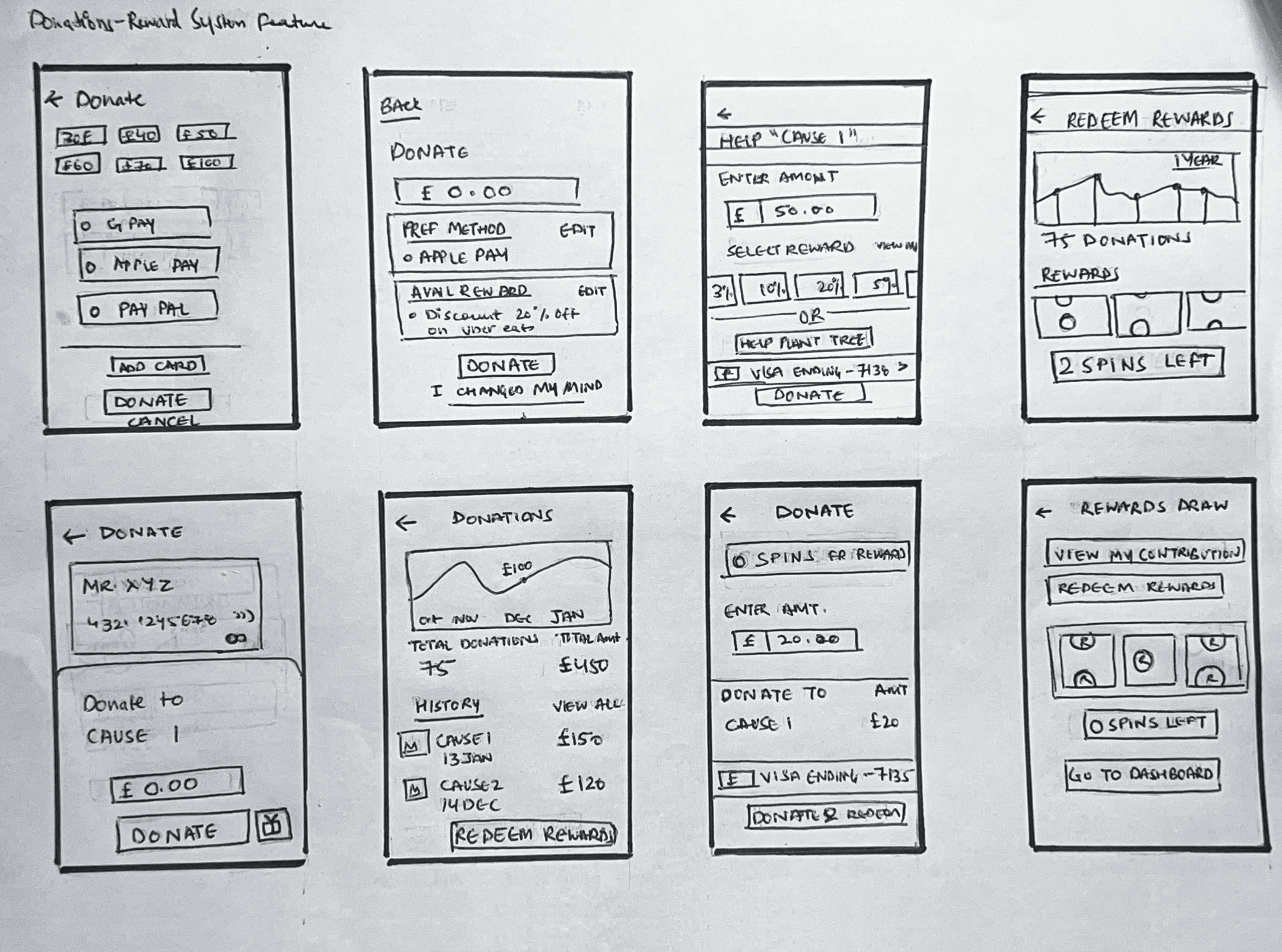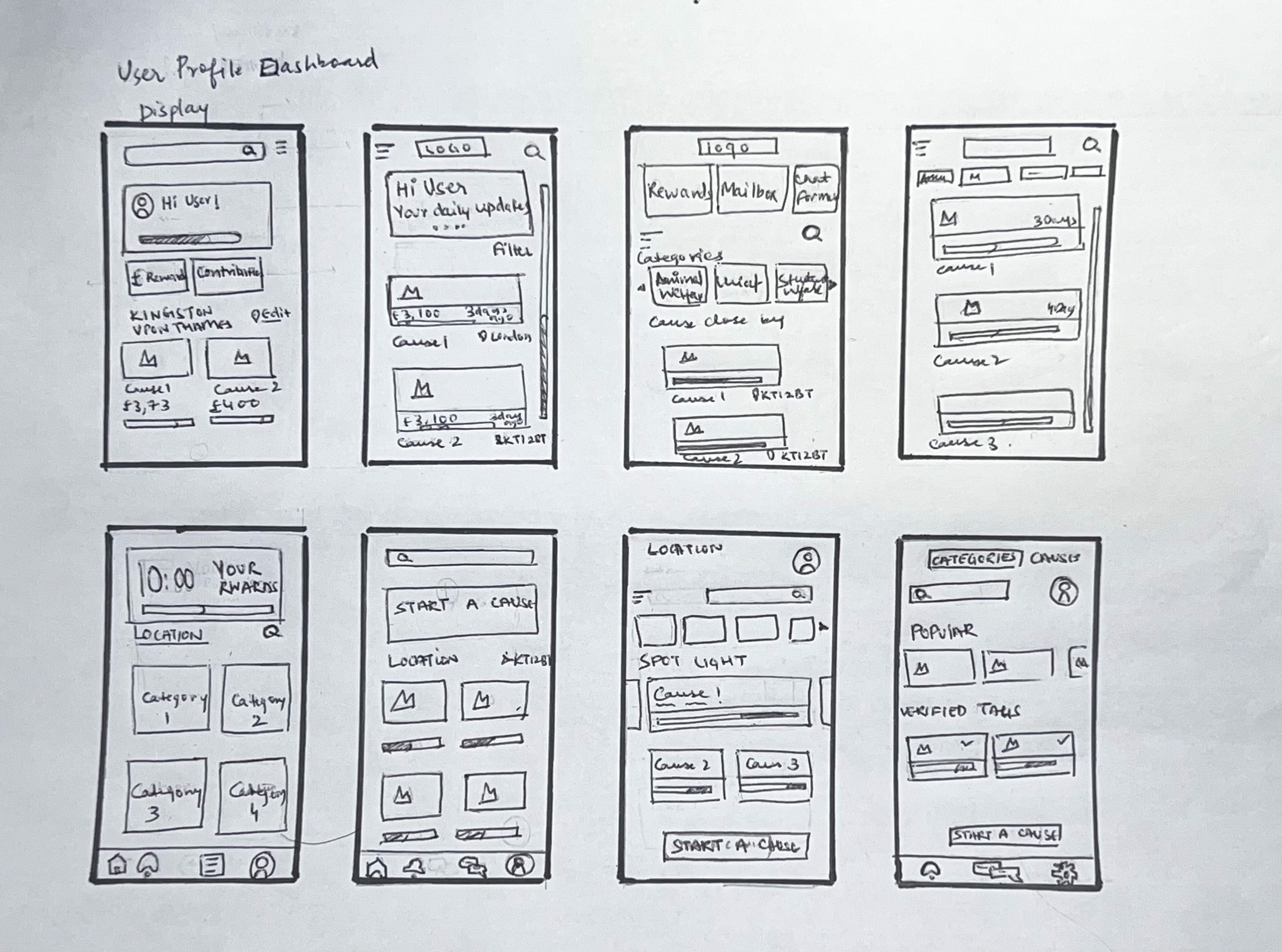 Following the Rapid idea generation technique, crazy 8 technique was also used to ascertain the type of design layout both in terms of good UX and UI. Firstly, screens for the user profile were created to ascertain the best possible layout followed by the donation page.