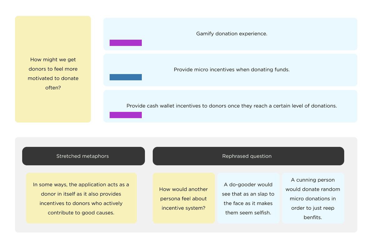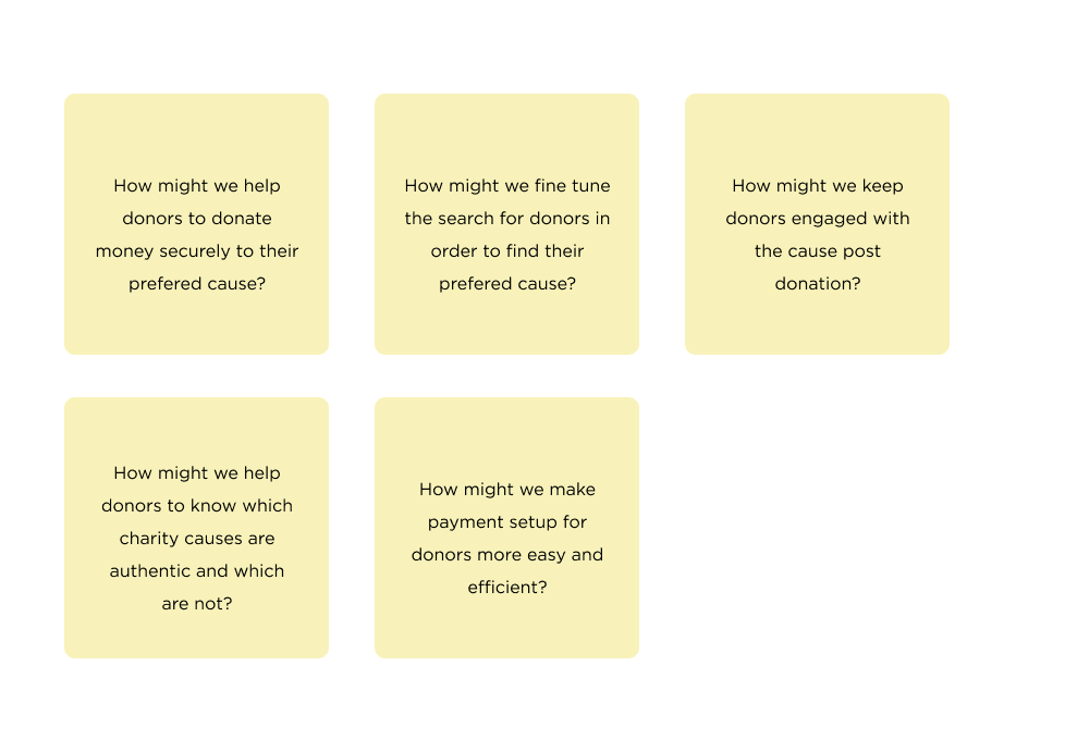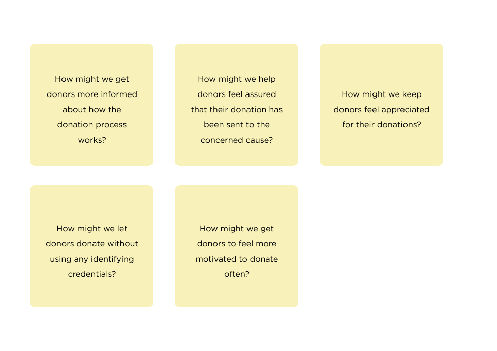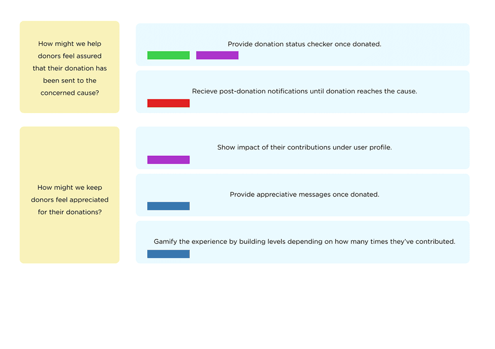 Based on the user stories, How might we questions were formed to initiate the ideation phase of this project process. Each persona had a set of 5 how might we questions.